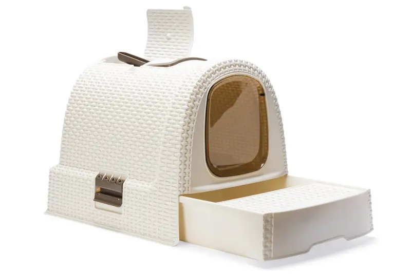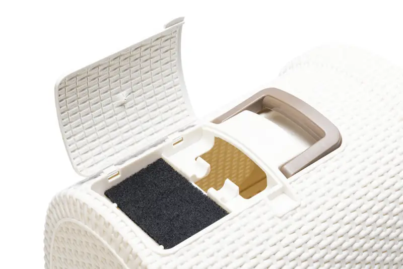 Deze Curver Kattenbak bestaat voor 95% uit gerecycled materiaal (huishoudelijk plastic afval en oude visnetten op de bodem van de zee (ocean waste)). De overige 5% zijn nieuwe grondstoffen. De hele kattenbak is op zijn beurt ook weer 100% recyclebaar. De kattenbak heeft een modieuze uitstraling doordat het een motief heeft van gevlochten rattan. De lade aan de voorkant heeft een plateau met gaatjes, waardoor de kat een groot deel van het kattenbakgrit achterlaat in de bak alvorens de kattenbak te verlaten. Door de uitschuifbare lade kan je in een oogopslag zien of de kattenbak aan verschoning toe is. Aan de bovenkant van de kattenbak bevindt zich een klepje waar de kattenbakschep opgeborgen kan worden. De Curver Kattenbak is zo mooi dat je nauwelijks ziet dat het een kattentoilet is.